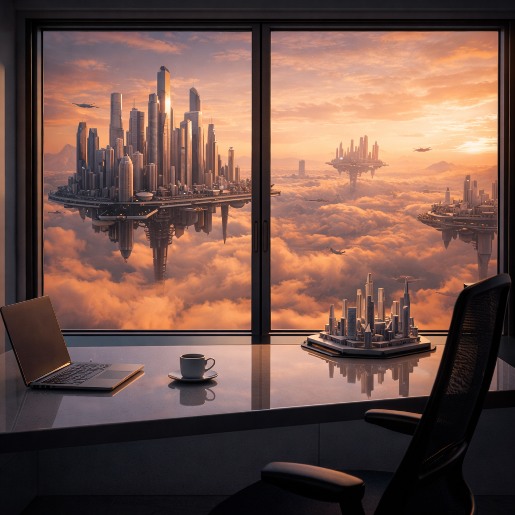 Vue sur une ville flottante avec coucher de soleil